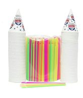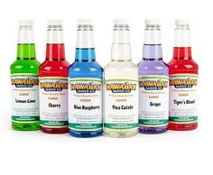 Variety packs of snow cone syrup is available in 16 oz. or 32 oz. Flavors included are cherry, lemon-lime, pina colada, blue raspberry, tiger's blood, & grape. Free pour dispensers included.