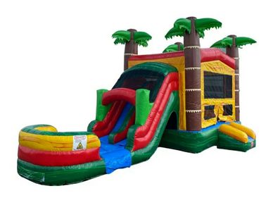 The caribbean combo is a bounce house with a double climbing wall and double slide. The palm trees give it a tropical look. This inflatable can be used wet or dry. Perfect for summer events, birthdays, churches and more.