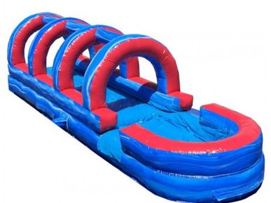 The Tsunami Slip n Slide w/ pool is a refreshing thrill ride. One rider at a time runs & dives onto the 27' inflatable. The misting hose above ensures a slippery wet surface. The rider lands in the pool at the end. Bounce house in Noblesville, Indianapolis, Cicero, Westfield, Carmel, Fishers, Tipton and central Indiana. Bounce house rentals.