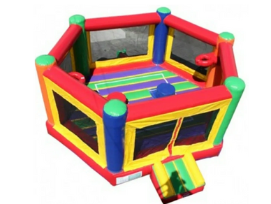 OctoDome 5-n-1 is an all in one inflatable. Open roof, with finger safe netting on every wall. Removable jousting pedistals, 2 basketball hoops. It even has a heavy duty twister game that can be attached with velcro. It offers these activities!