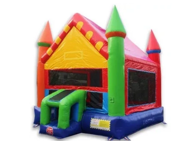 The multicolored castle bounce house is a traditional bounce house plus it also has a basketball hoop and (2) pop ups to add to the fun. Perfect for backyard birthday parties and more.