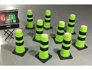 The cone/pylon interactive play system (IPS) is a electronic scoring system that works with 10 wireless discs that are placed on cones. The disc's will change colors and make sounds triggering the players to tap the discs for points. Set up different courses to make it more challenging. Great for team building, indoor or outdoor events, schools, churches, after-proms and more.